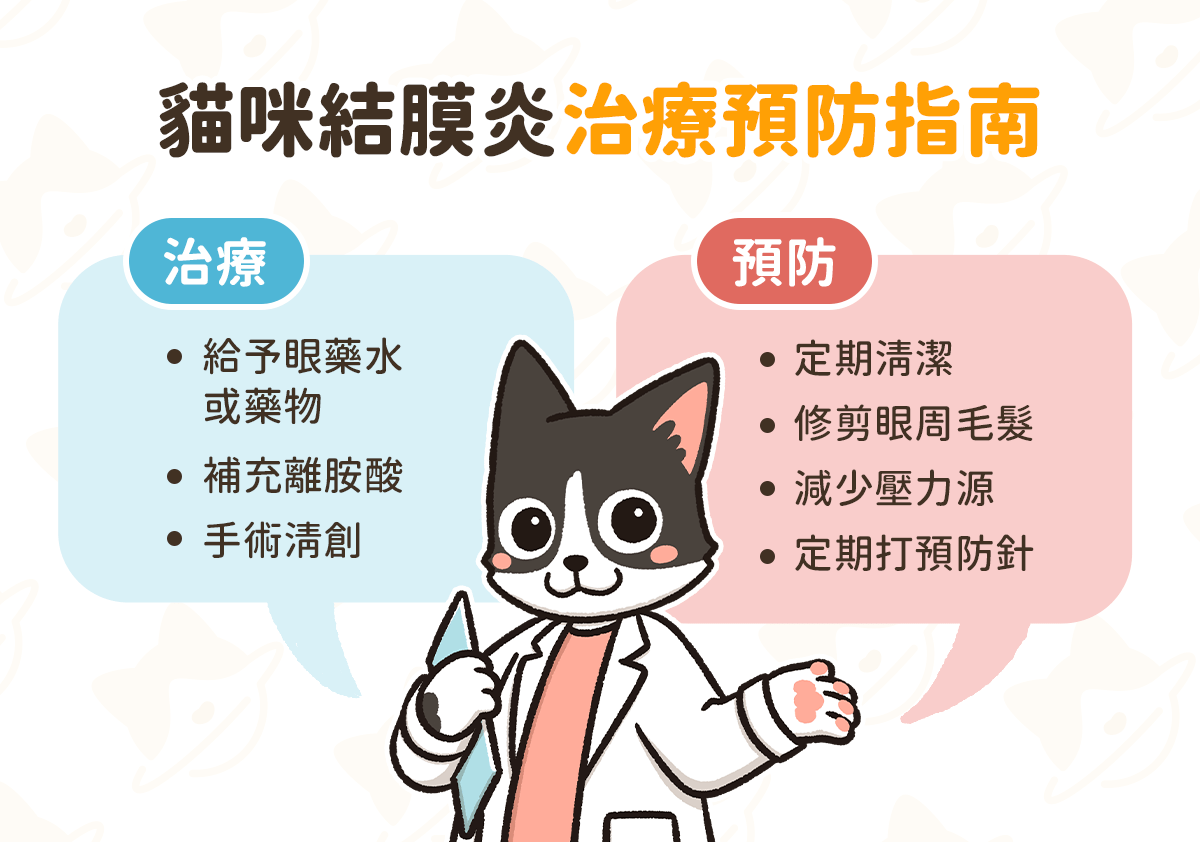 透過定期清潔眼周同修剪毛髮、維護環境質素、減少壓力來源及定期打預防針,都能有效預防結膜炎翻發。