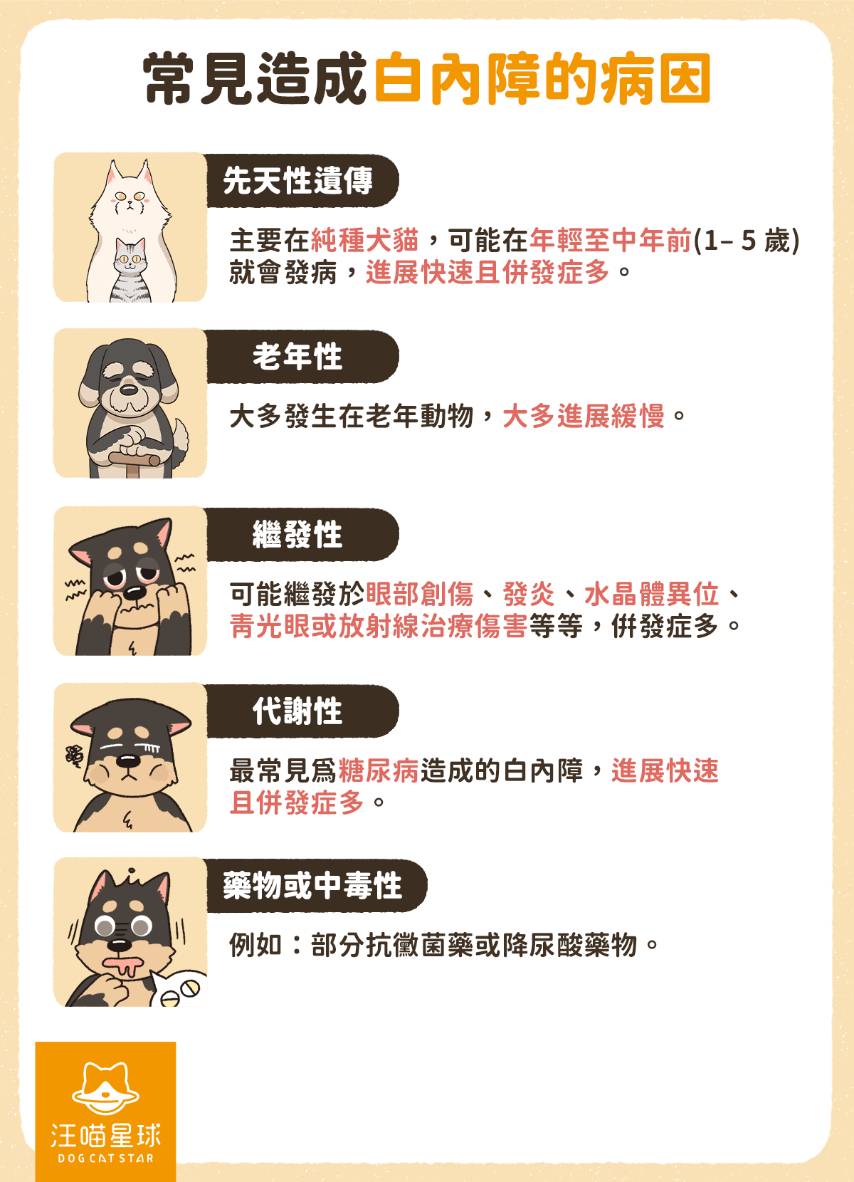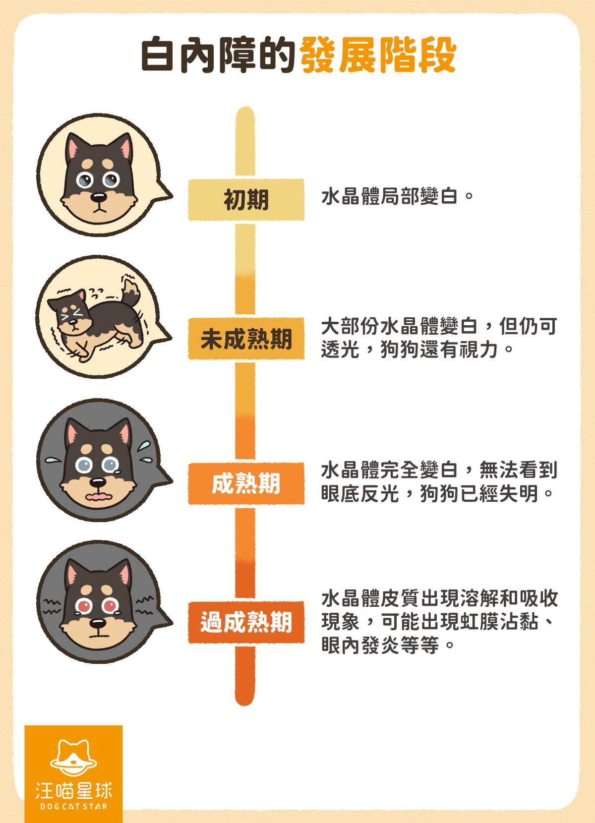 初期水晶體會局部變白,但狗狗仲睇到嘢。隨住病情發展,視覺受損會引發行為改變,例如:夜晚唔敢行、行路歪埋一邊等。最後水晶體會完全變白(白濛濛一片)、失明,甚至引發眼內發炎。所以及早發現、及早醫治真係好緊要!