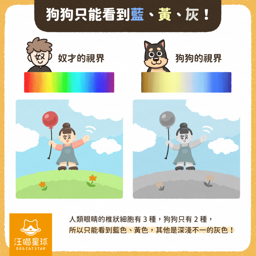 狗狗其實只能夠睇到藍色、黃色,同埋其他深淺唔同嘅灰色。呢個係因為狗狗嘅眼睛只有兩種椎狀細胞,而人類就有三種。