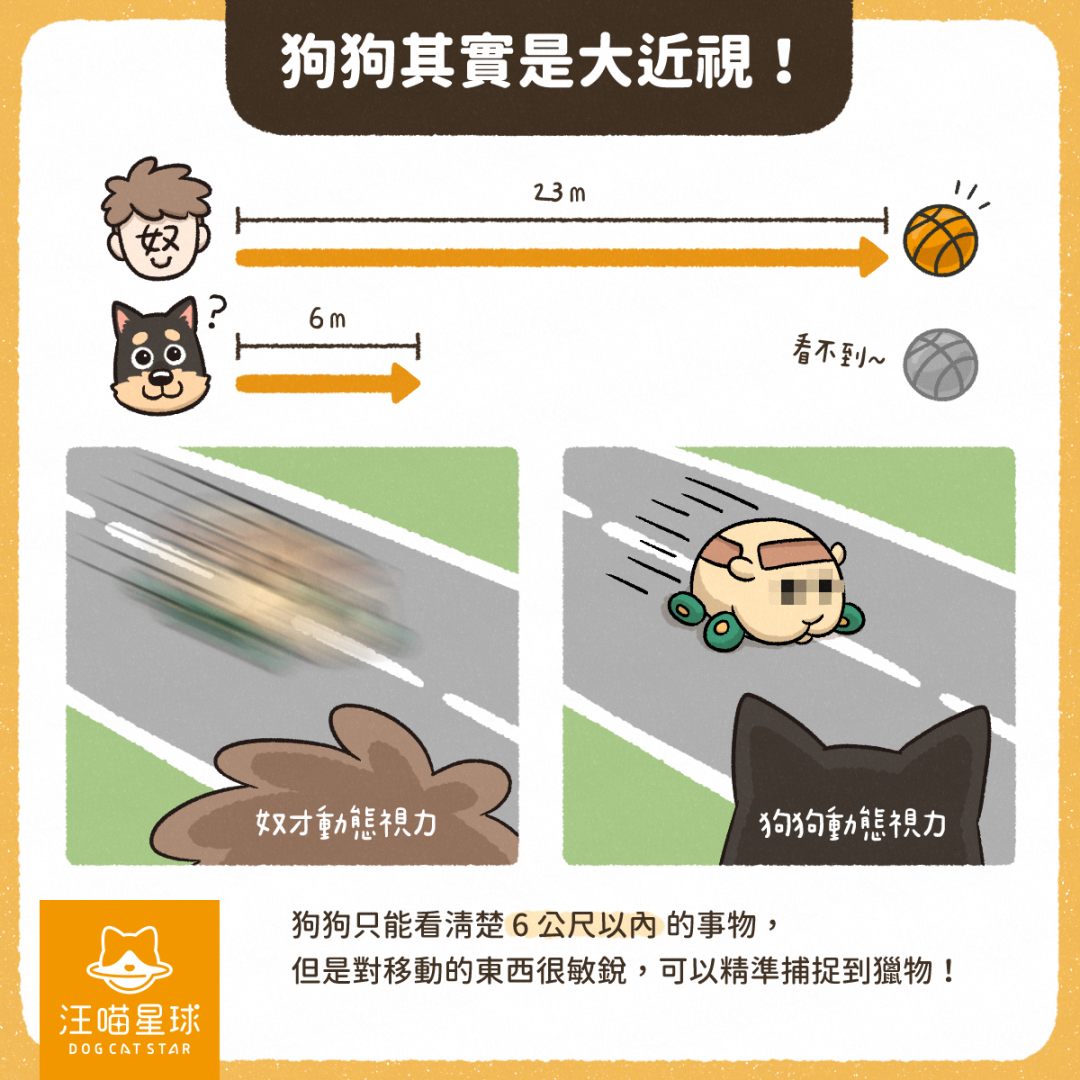 狗狗係名副其實嘅「大近視」,佢哋通常只能夠睇清楚 6 米以內嘅嘢,所以太遠嘅景物,狗狗其實係睇唔清㗎。