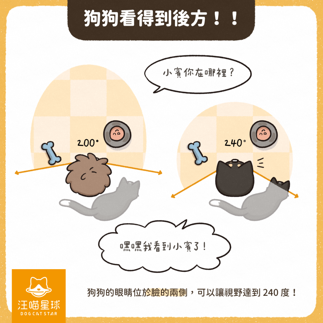 狗狗對眼生喺面部兩側,令佢哋嘅視野可以達到 240 度。只要獵物喺呢個範圍出現,佢哋就可以極速發現。相比之下,人類只能夠睇到前方大約 200 度,視覺範圍窄好多!
