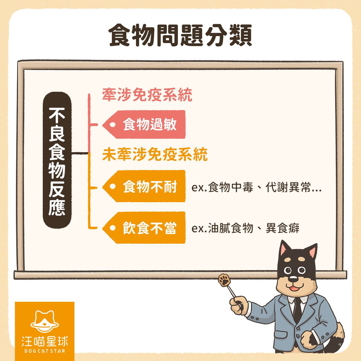現時獸醫界嘅共識係,所有因食物引發嘅問題統稱為「不良食物反應」,再根據有無牽涉免疫反應分開兩類: