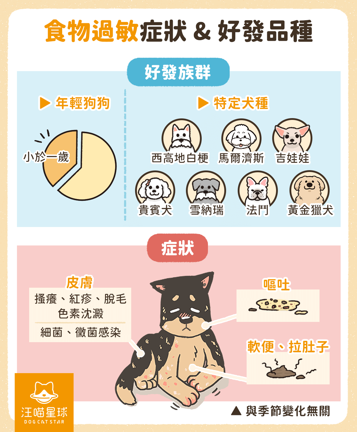 徵狀發作同季節無關。大部分狗狗會瘋狂抓癢,仲會伴隨腸胃問題,好似嘔、肚屙咁。