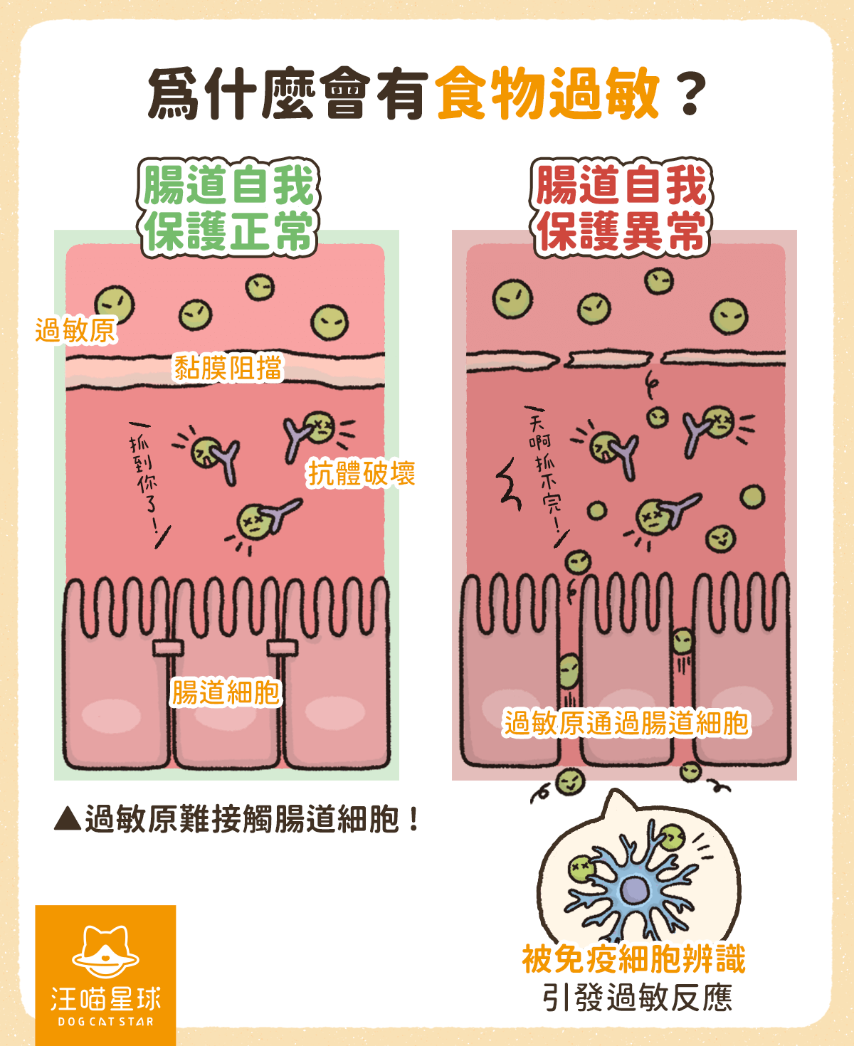 腸道淋巴係身體最大嘅免疫器官之一,所以食物先至咁容易成為過敏來源。另外,如果狗狗之前得過病毒性腸炎,腸道黏膜通透性改變咗,過敏風險亦會提升。