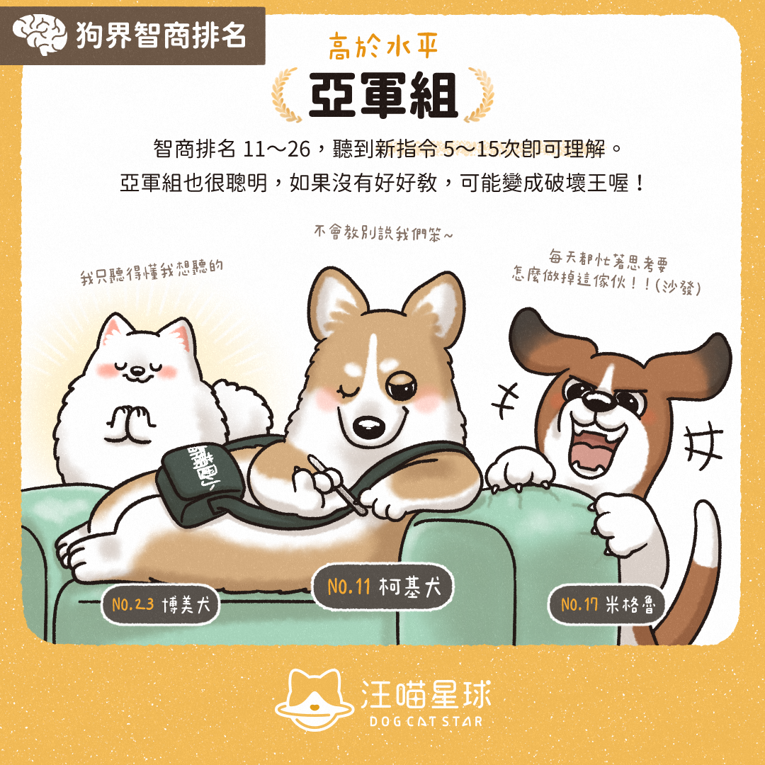 亞軍組嘅智商高過平均水平!排名喺 11 至 26 名,聽到新指令 5 到 15 次就學得識,都係好醒目嘅代表!如果無好好教導,佢哋隨時會變身成「破壞王」㗎。 上榜狗狗: 哥基犬、比格犬(Beagle)、松鼠狗(博美)等等。