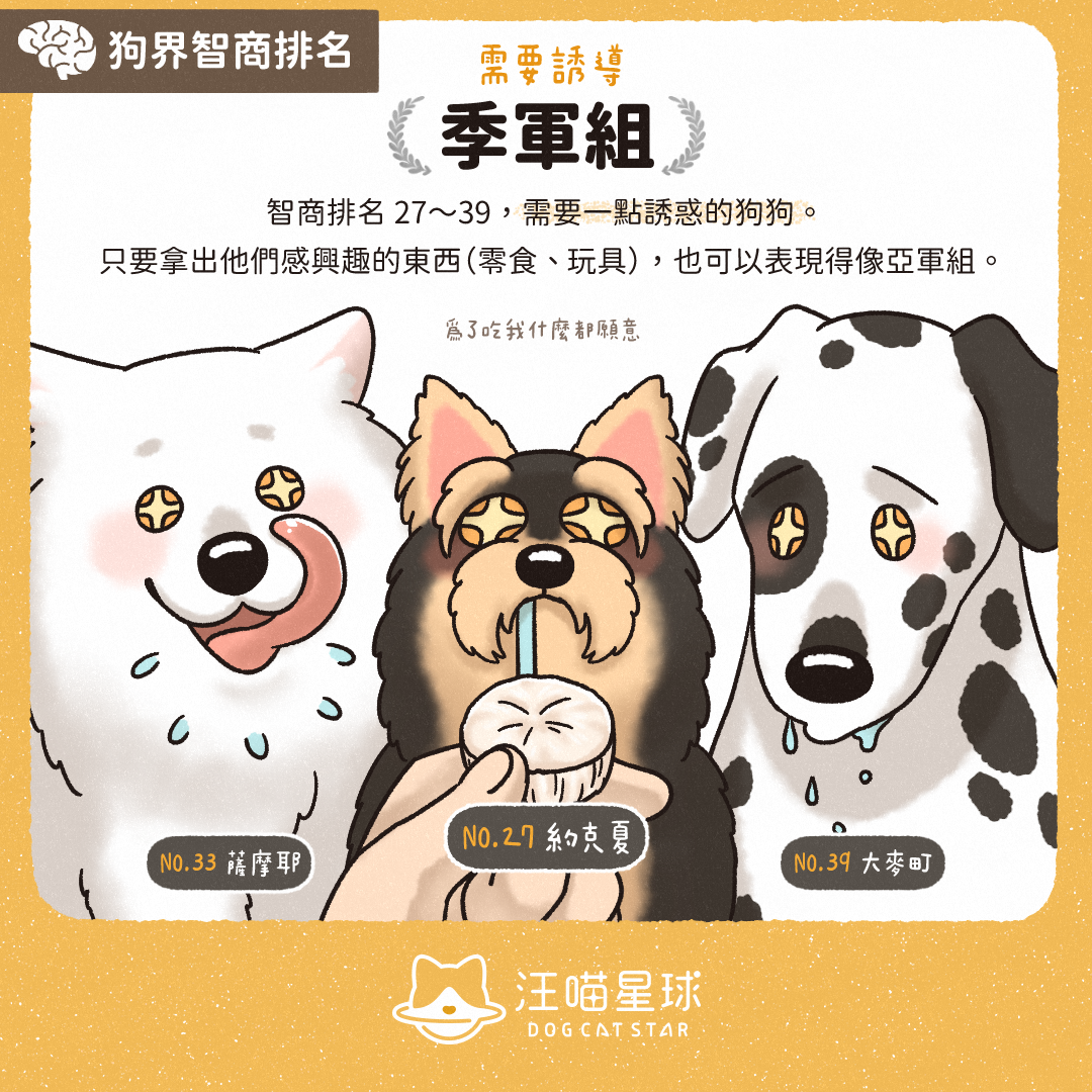 季軍組排名喺 27 至 39 名,係需要「誘惑」嘅狗狗。只要攞出佢哋感興趣嘅嘢(好似零食、玩具),佢哋嘅表現可以同亞軍組一樣出色。 上榜狗狗: 約瑟爹利、薩摩耶、大麥町等等。
