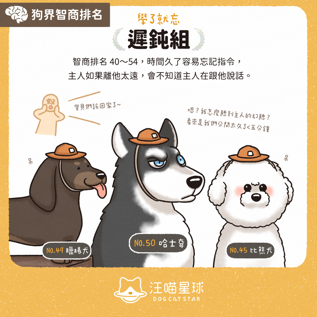 遲鈍組嘅狗狗容易「學完就唔記得」,排名喺 40 至 54 名。時間一耐咗就容易忘記指令。另外,如果你離佢太遠,佢可能唔知你同佢講緊嘢。 遲鈍組代表: 哈士奇、比熊犬、臘腸犬等等。
