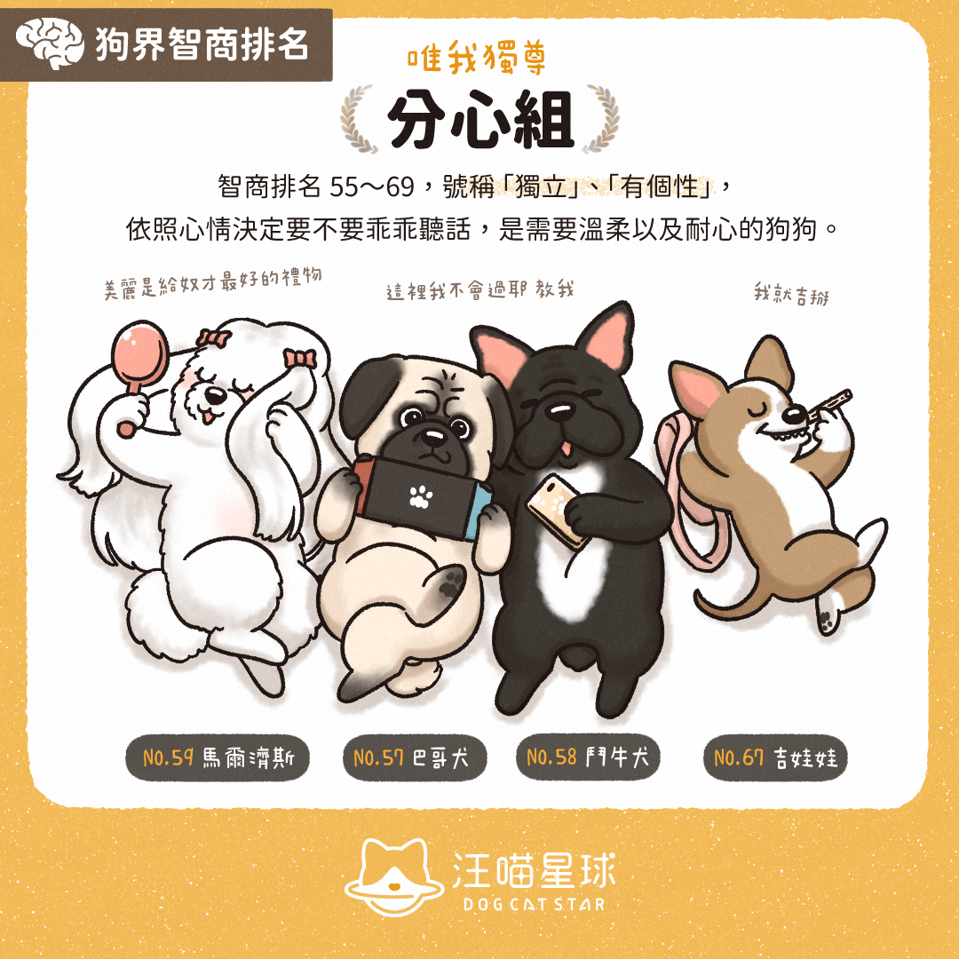 「我行我素」嘅代表就係佢哋喇!排名喺 55 至 69 名,號稱「獨立」、「有個性」,聽唔聽話要視乎佢嗰陣嘅心情。養佢哋需要極大嘅溫柔同耐性呀。 分心組代表: 八哥犬、鬥牛犬、瑪爾濟斯、吉娃娃等等。