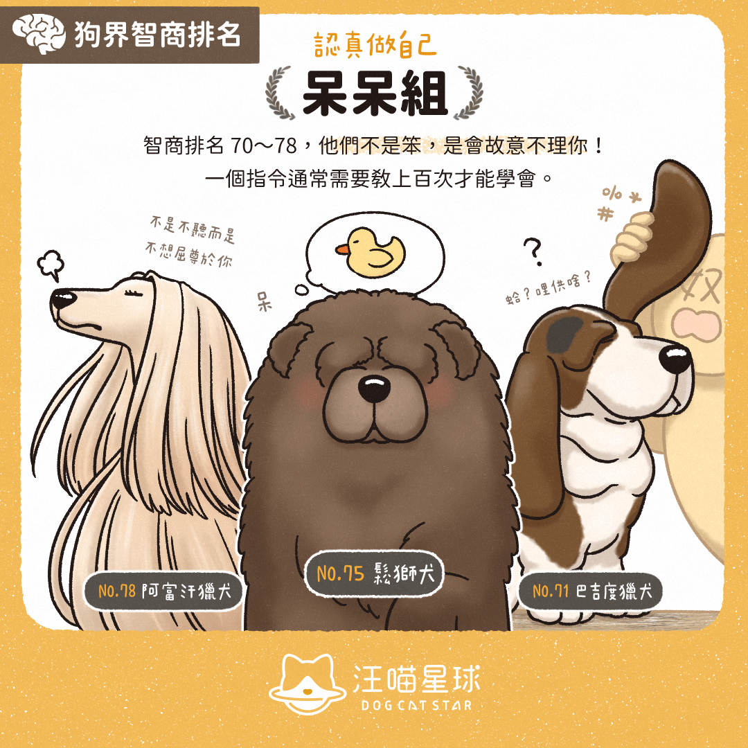 智商排喺 70 至 78 嘅呆呆組其實唔係笨,係佢哋「認真做自己」!一個指令通常要教過百次先至學得識。 呆呆組代表: 巴吉度獵犬、鬆獅犬、阿富汗獵犬等等。
