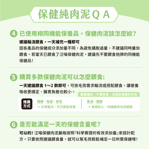 若當天已餵食了汪喵保健肉泥,建議先不要餵食他牌的同機能保健品!