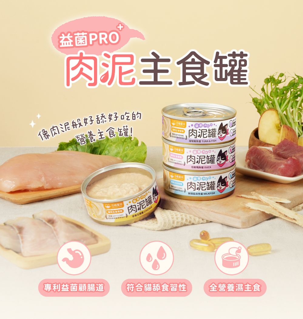 肉泥罐營養配方針對全齡貓打造,除了添加益菌配方,顧腸胃助消化,以及中低卡路里也符合現代室內貓少運動的習性,以維持健康好身材!