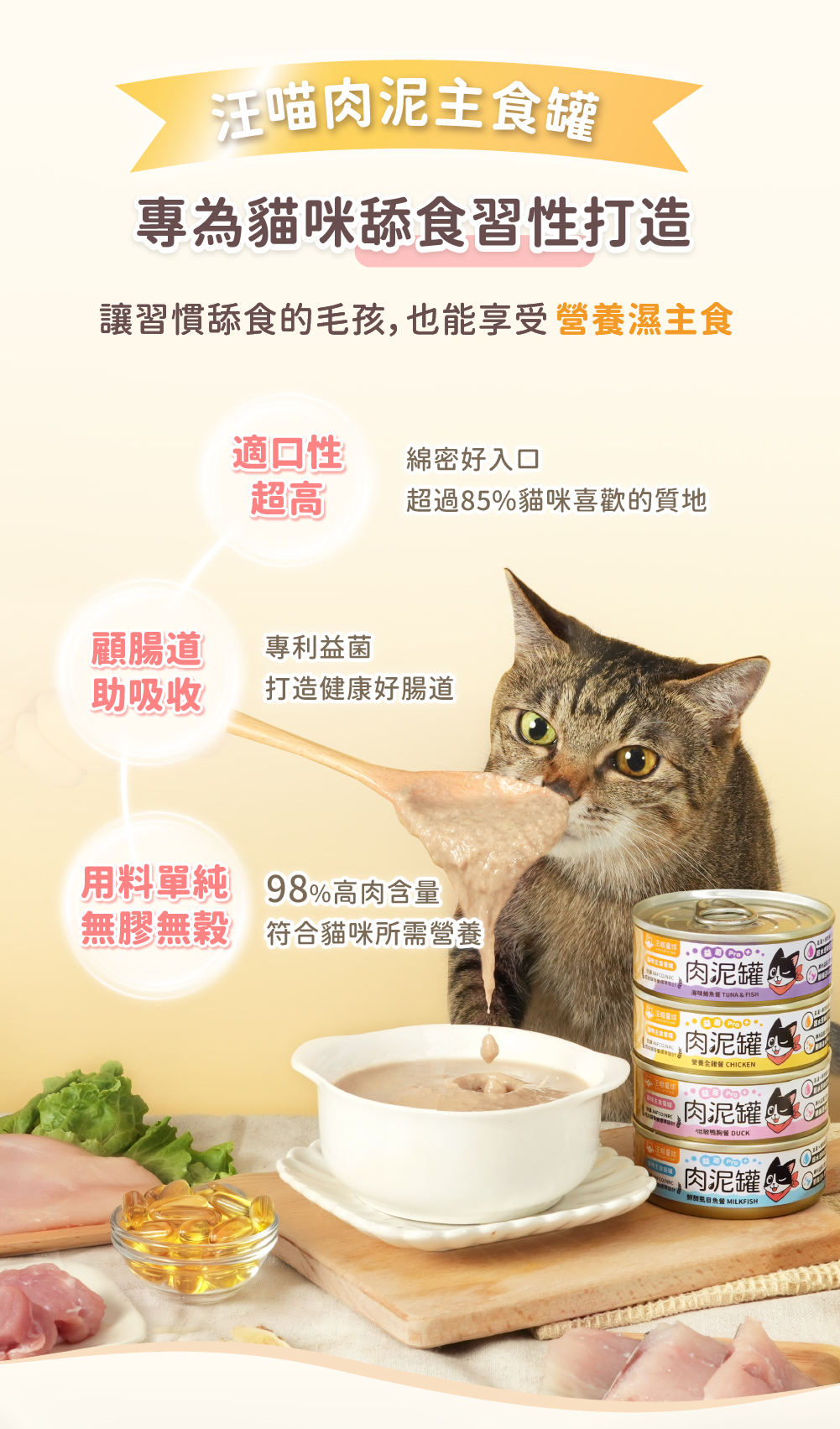 對貓咪來說,影響嗜口性的原因有很多,除了肉種口味外,「質地」也很重要!這些年汪喵發現對習慣「舔食」的貓咪來說,質地相對滑順的「肉泥狀」,貓咪好入口、更喜歡吃。因此仿肉泥型態,打造這款「營養符合貓咪需求x成分天然健康」的肉泥罐,希望讓喜歡舔食的貓咪,也能健康享受濕食!