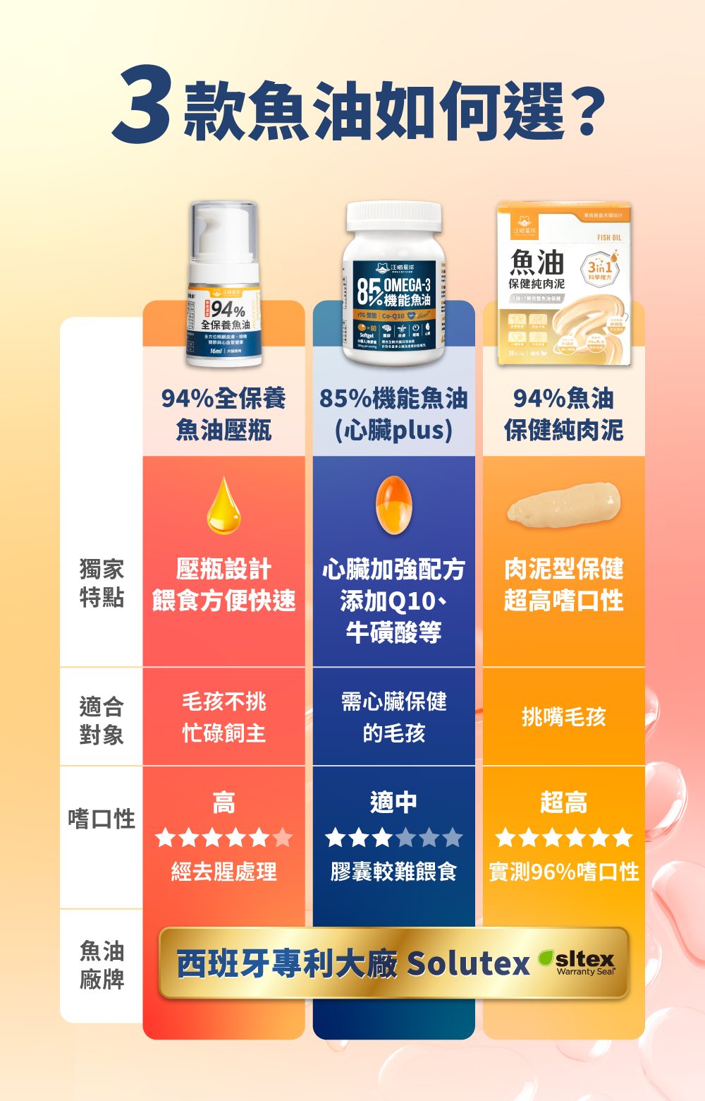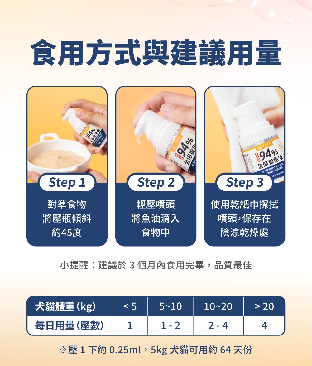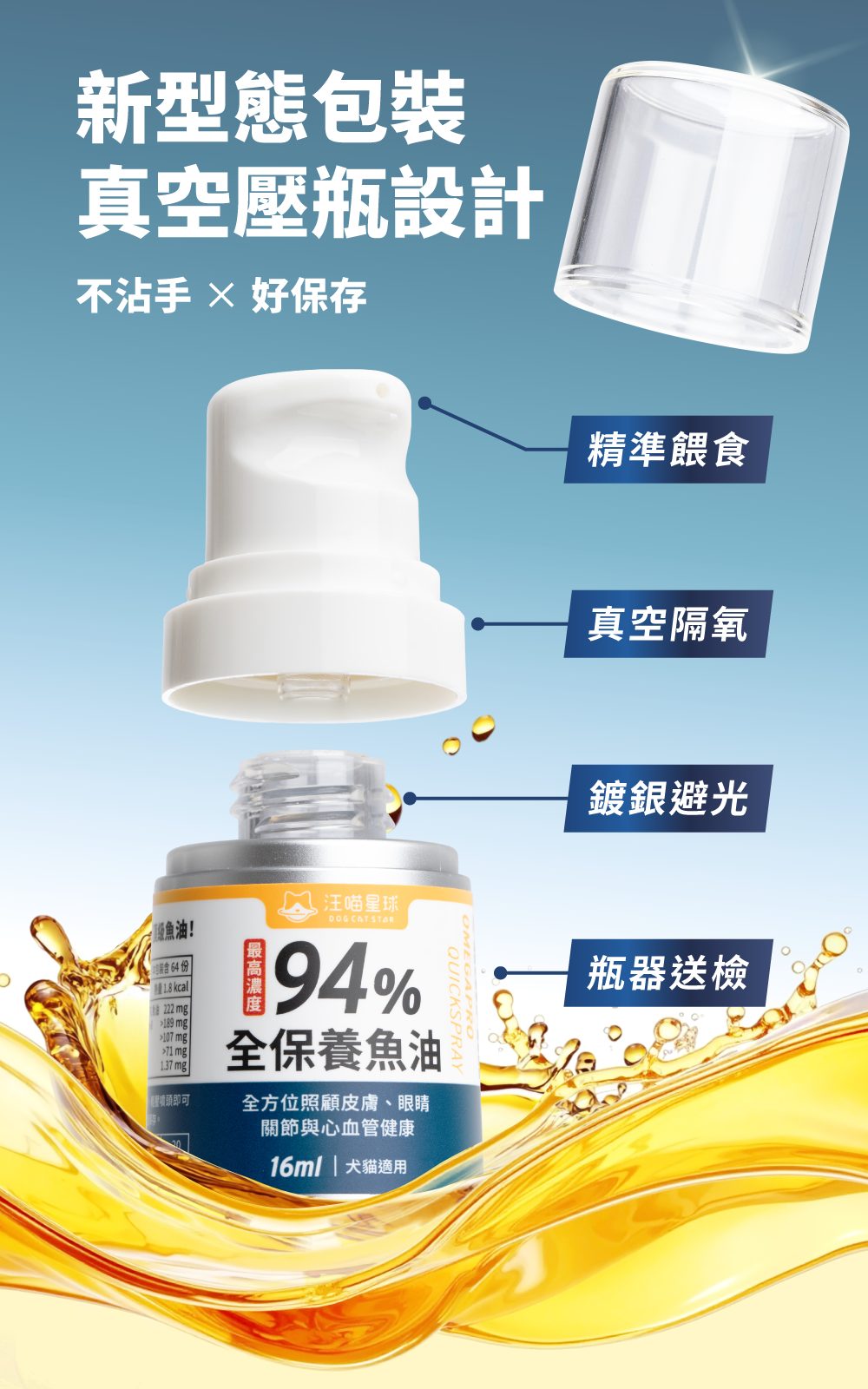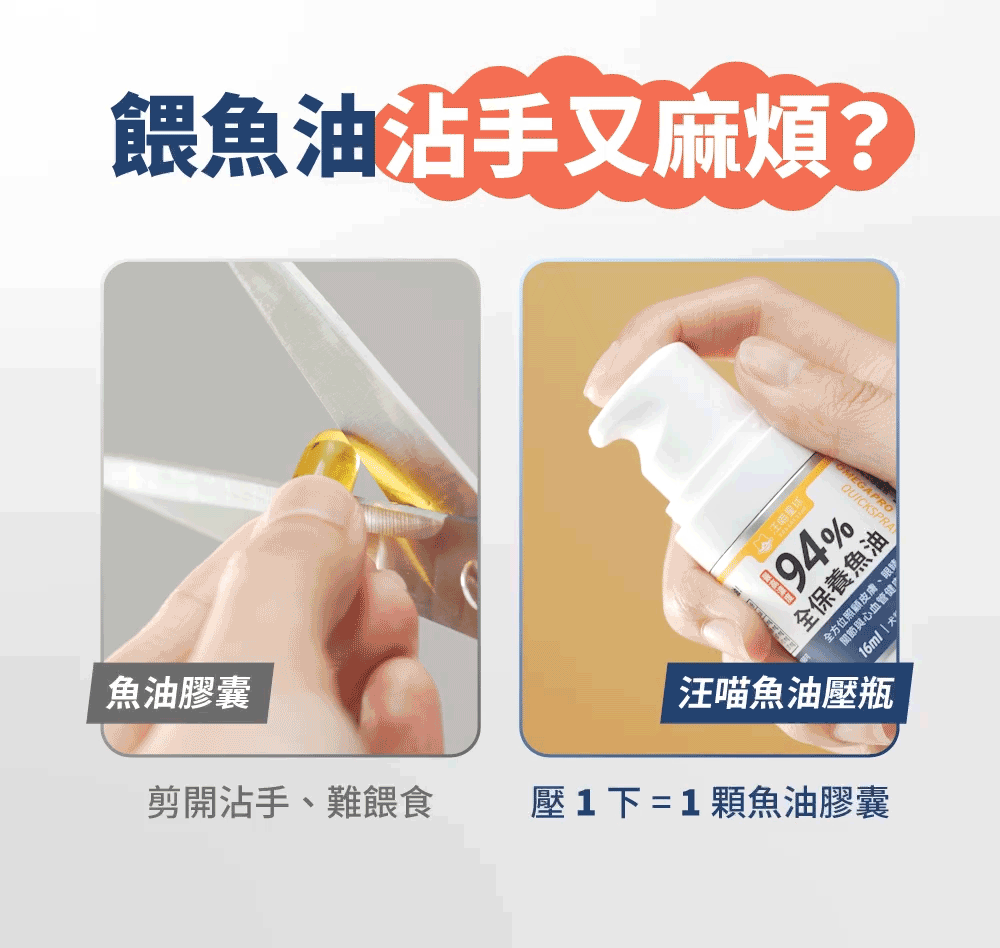 市面上的魚油多數以「膠囊」為主,由於膠囊在使用上非常不方便(容易粘手、不好餵食),因此我們研發出利用「壓瓶」取「代膠囊」劑型,瓶器也經過層層檢驗與測試,確保使用上更方便、也更新鮮!