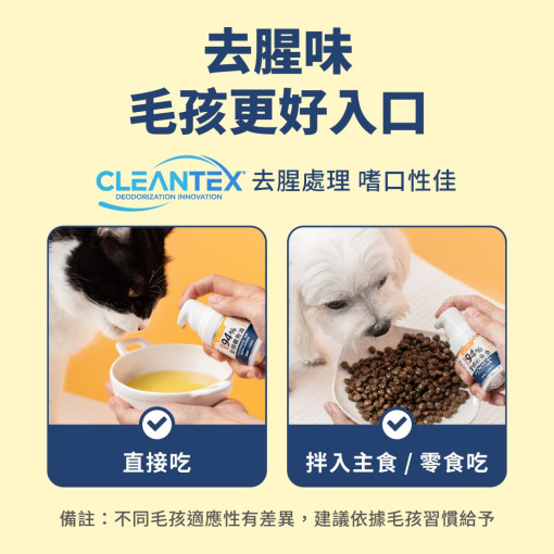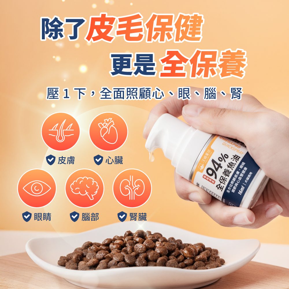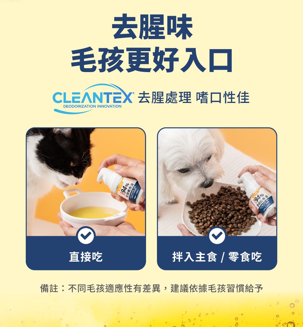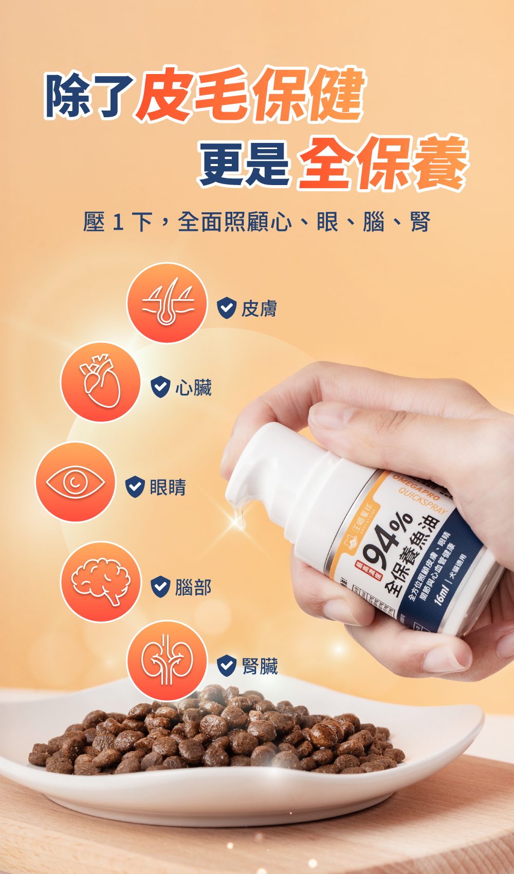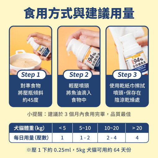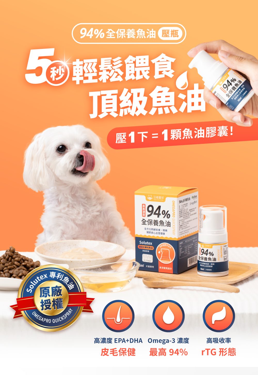 市面上的魚油多數以「膠囊」為主,由於膠囊在使用上非常不方便(容易粘手、不好餵食),因此我們研發出利用「壓瓶」取「代膠囊」劑型,瓶器也經過層層檢驗與測試,確保使用上更方便、也更新鮮!