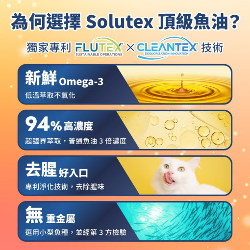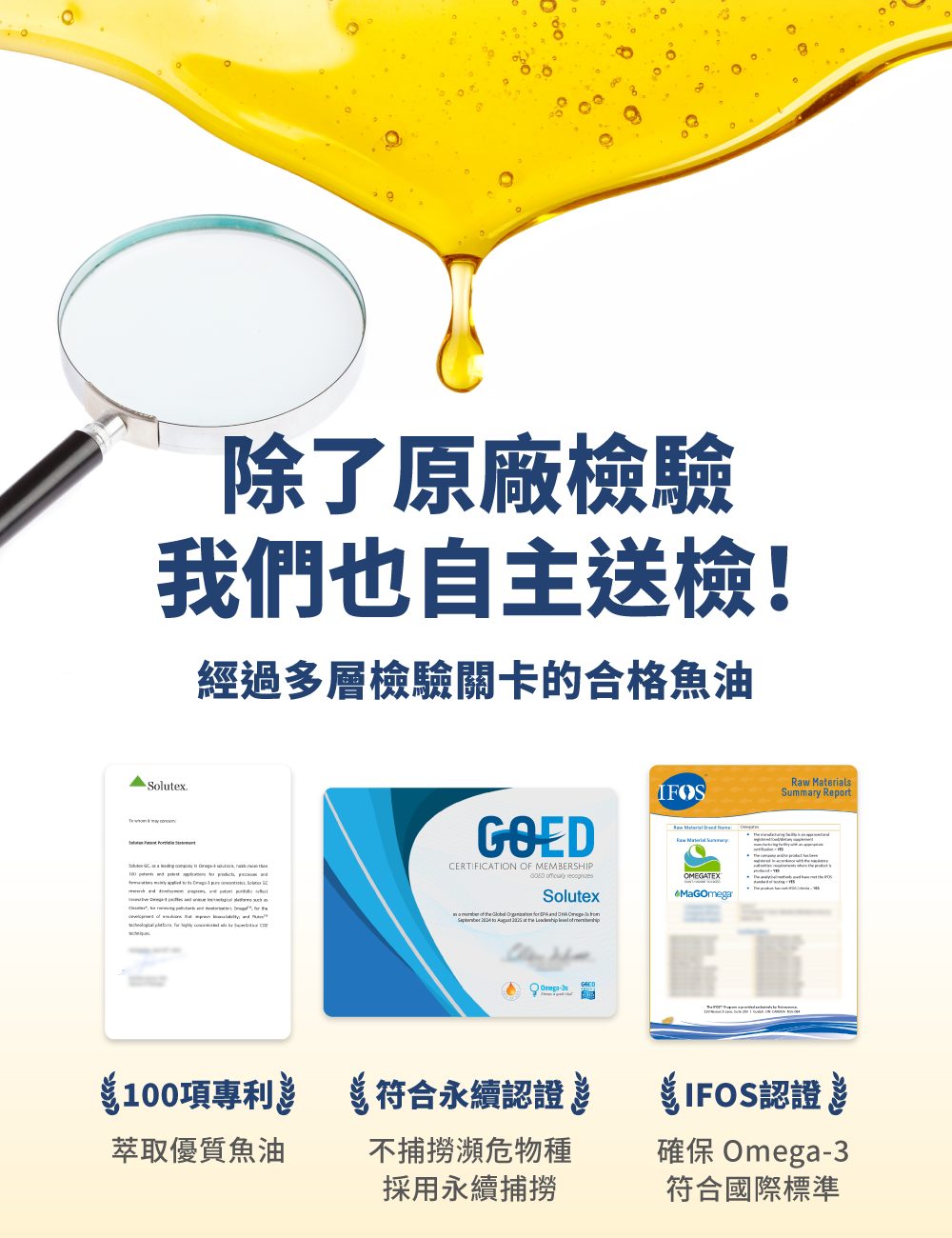 全魚油壓瓶選用國際知名的Solutex專利魚油,不單有超過百項的國際專利,也具備IFOS、GOED等國際組織認證,絕對是高品質魚油的首選!