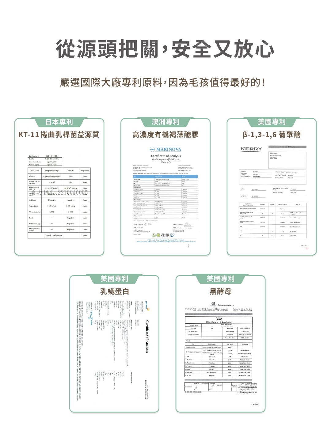 β-1,3/1,6葡聚醣、有機褐藻醣膠、膳食纖維、乳鐵蛋白、黑酵母、捲曲乳酸桿菌益源質