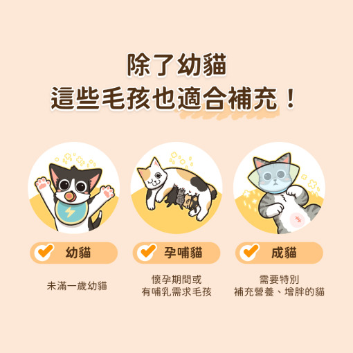 幼貓離乳後就可以開始食用,成貓後也可以使用喔!