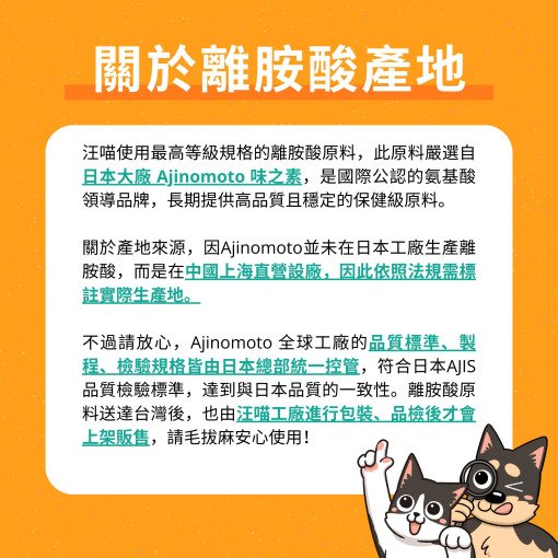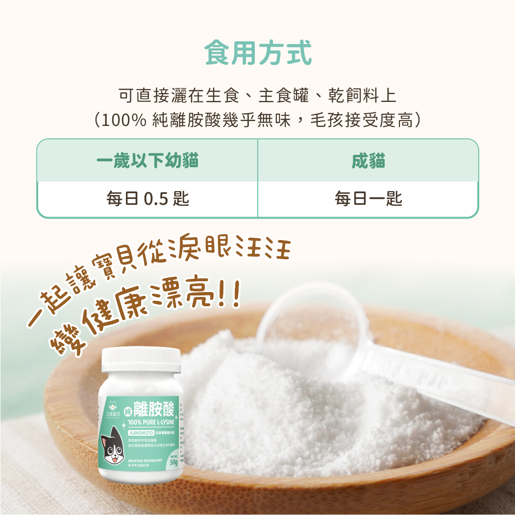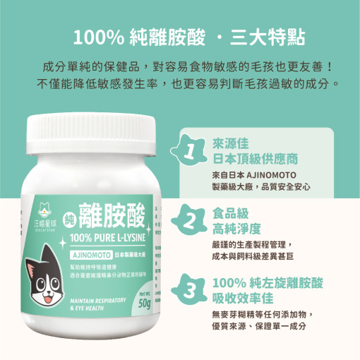 因汪喵星球主食都有經過營養配方師與獸醫師把關,符合貓咪完整日常所需營養,因此如果是健康貓貓且常以汪喵星球主食為主要主食來源,平常可以不用特別額外補充離胺酸。但若在換季時、幼貓老貓時期等身體較虛弱的時候,也可以偶爾給予補充哦!