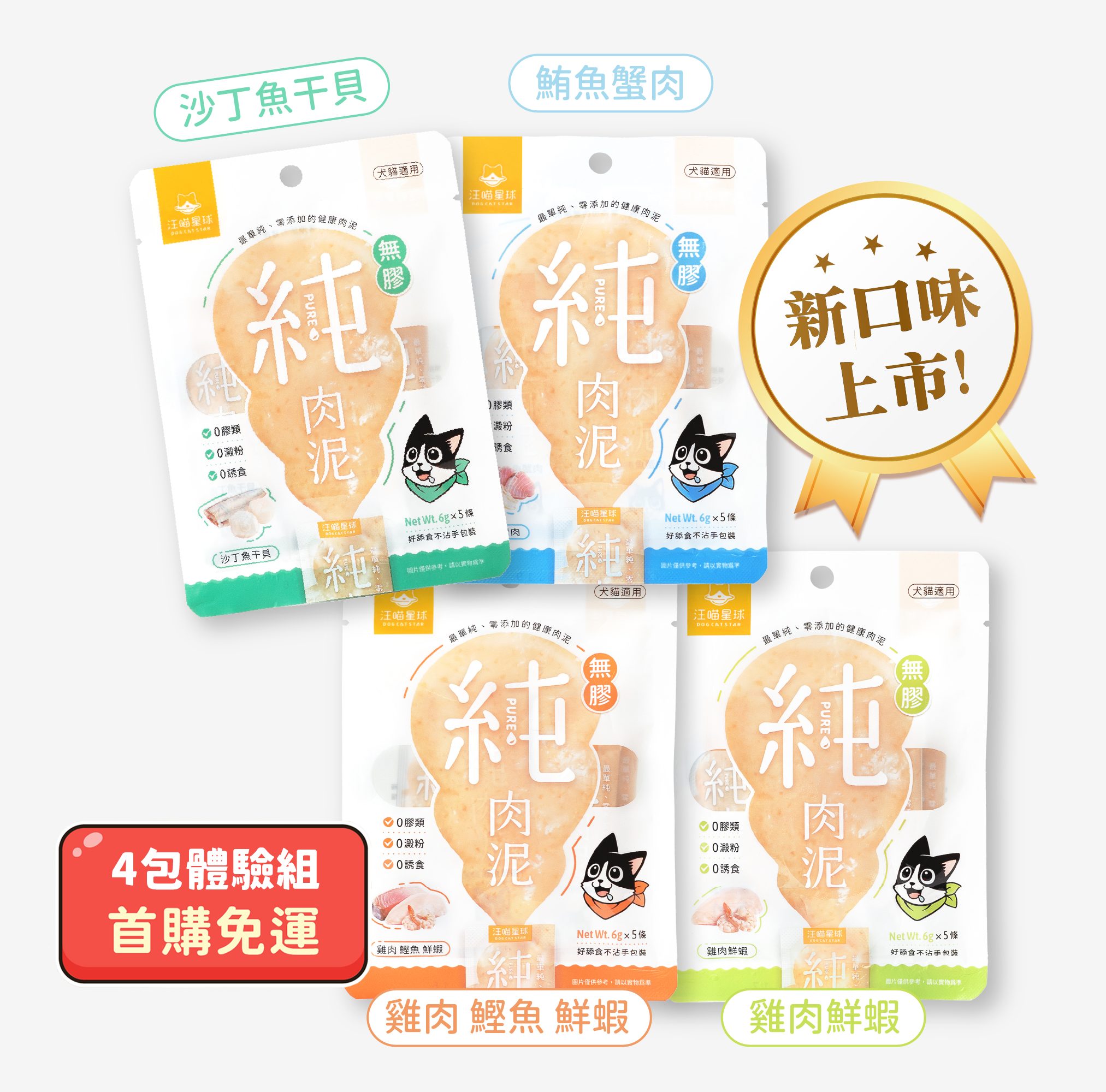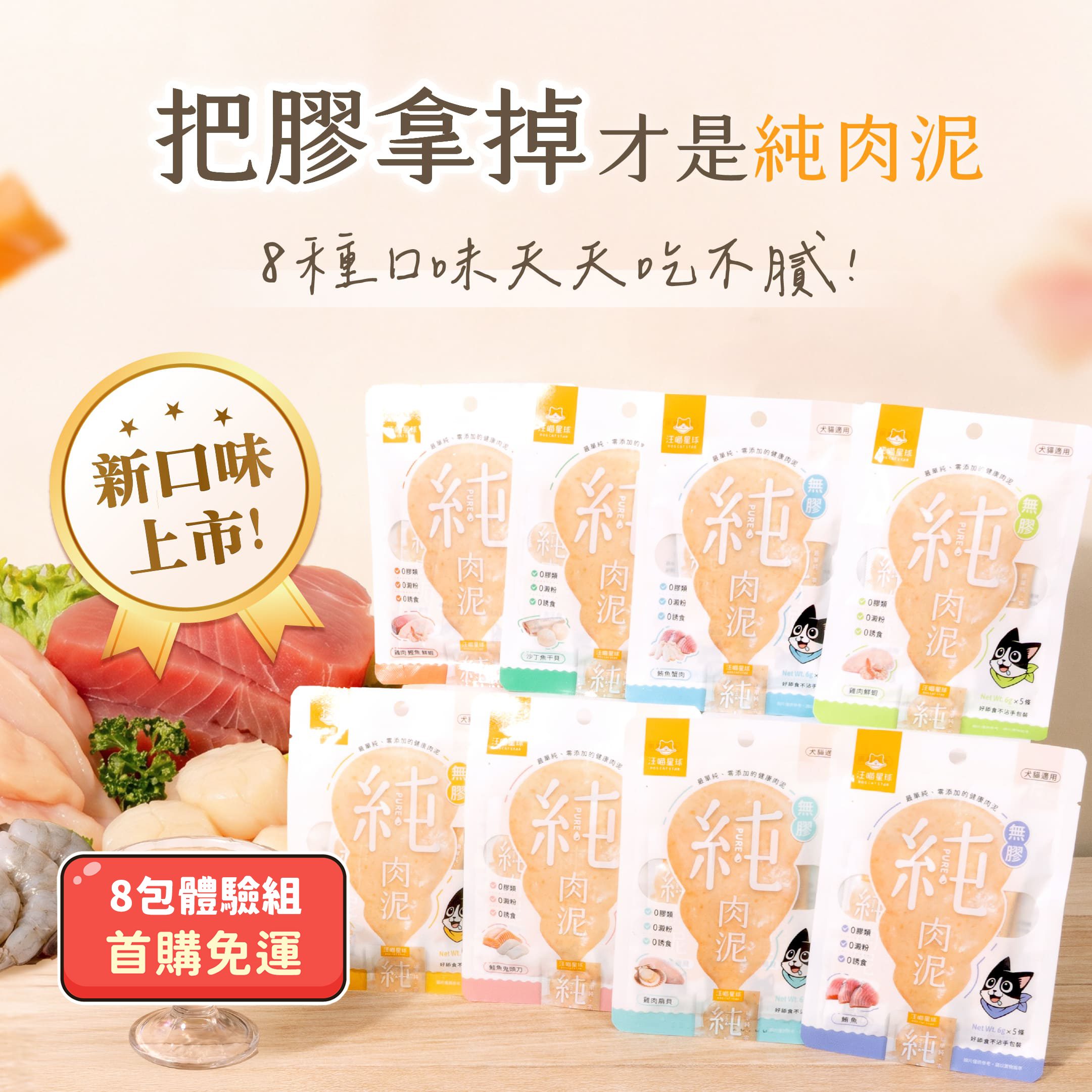 汪喵星球「無膠純肉泥」為零食,成分為100%天然食材,不管是貓咪還是狗狗,都可以食用喔!