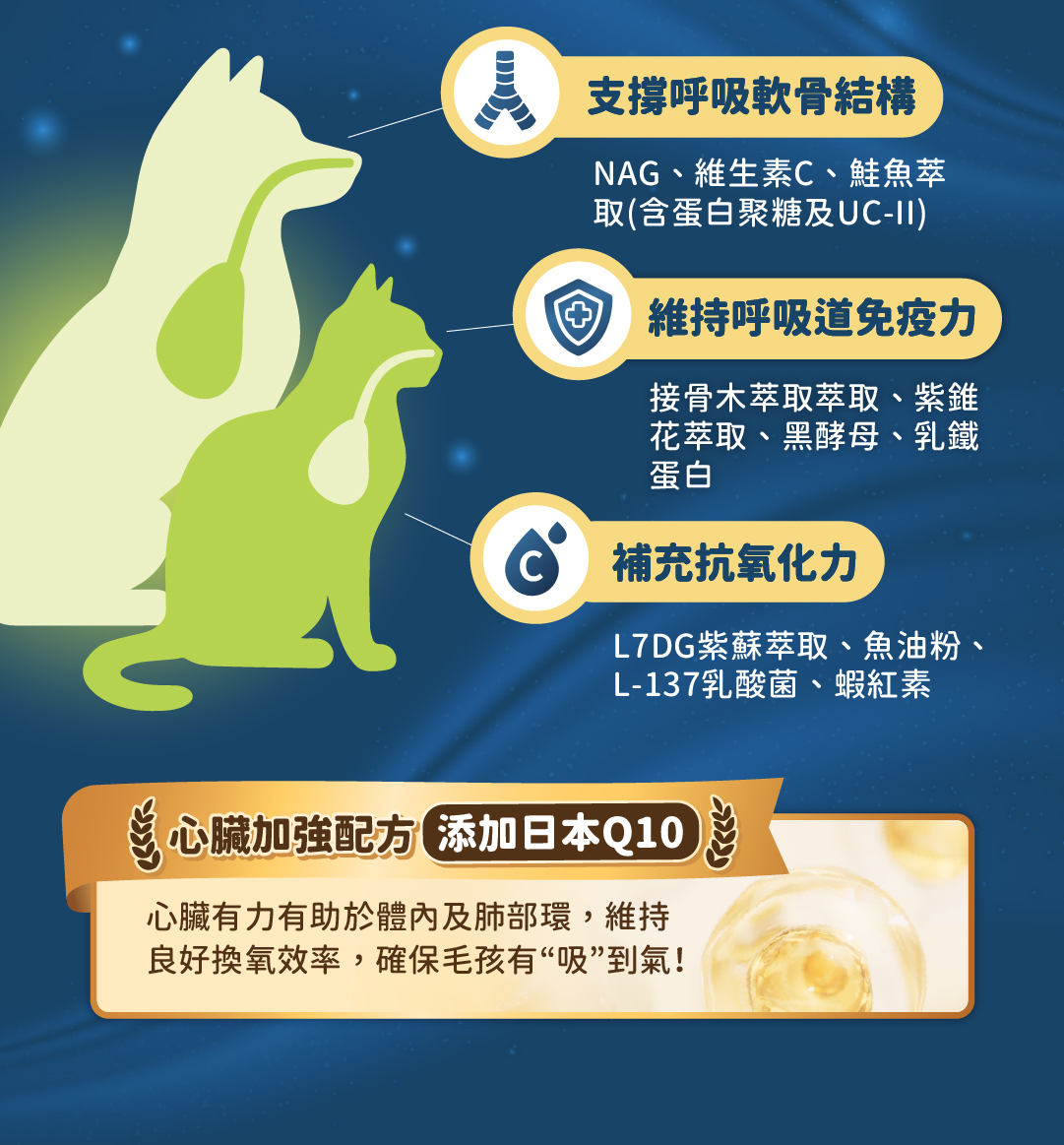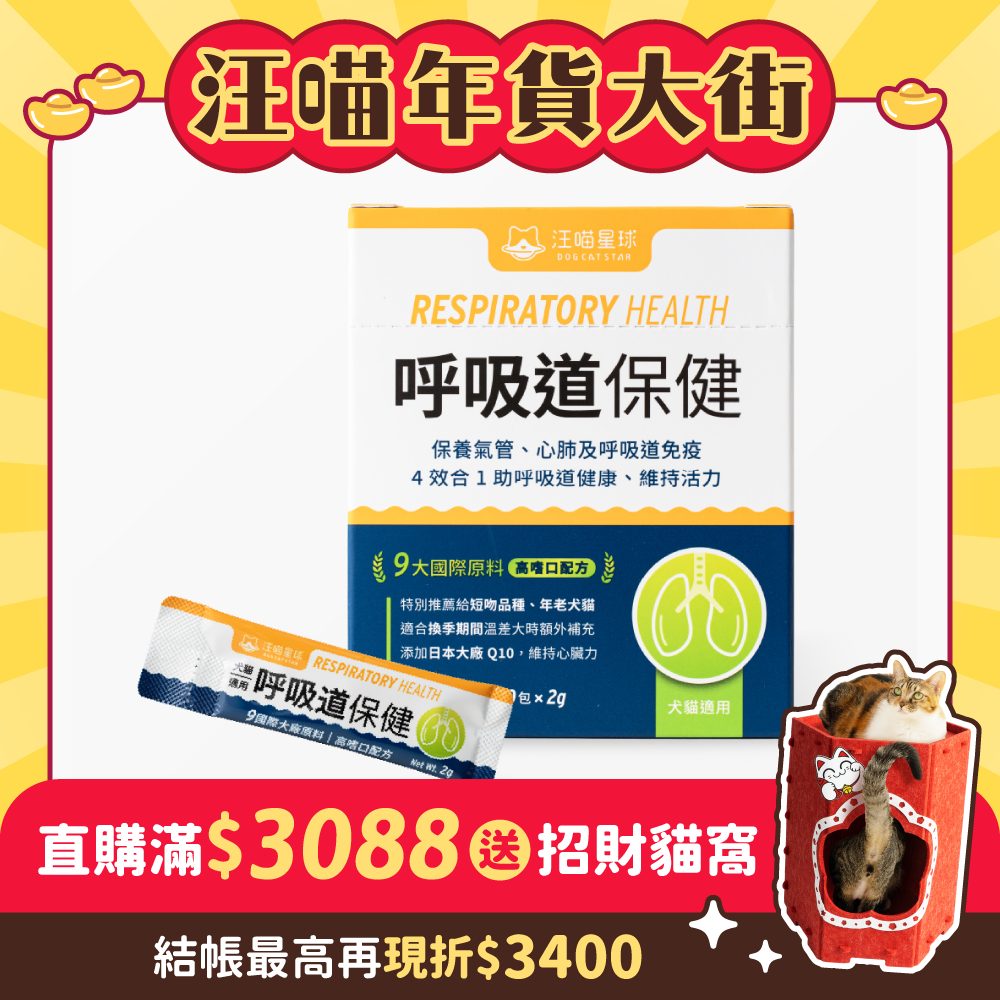 特別適合換季期間、經常外出,或是臉部較扁平(如法鬥、波斯貓) 的毛孩,提前維持呼吸道黏膜的健康,助於抵抗外在風險。